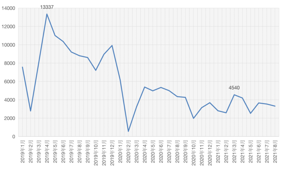 圖:2019年1月-2021年8月成都二手住宅成交套數走勢(單位:套)