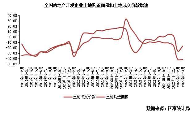 3月成都、重慶、合肥2022年首輪集中土拍拉動土地購置兩項指標降幅收窄。但從核心城市土拍成交情況來看,底價成交和國央企、平臺公司兜底情況仍廣泛出現。即使各市政府在土拍規則、競拍門檻、新房限價等方面多有調整,提高了地塊盈利空間,但民營房企參與度不高。債務壓力和信心不足下土地市場仍處于冰點。