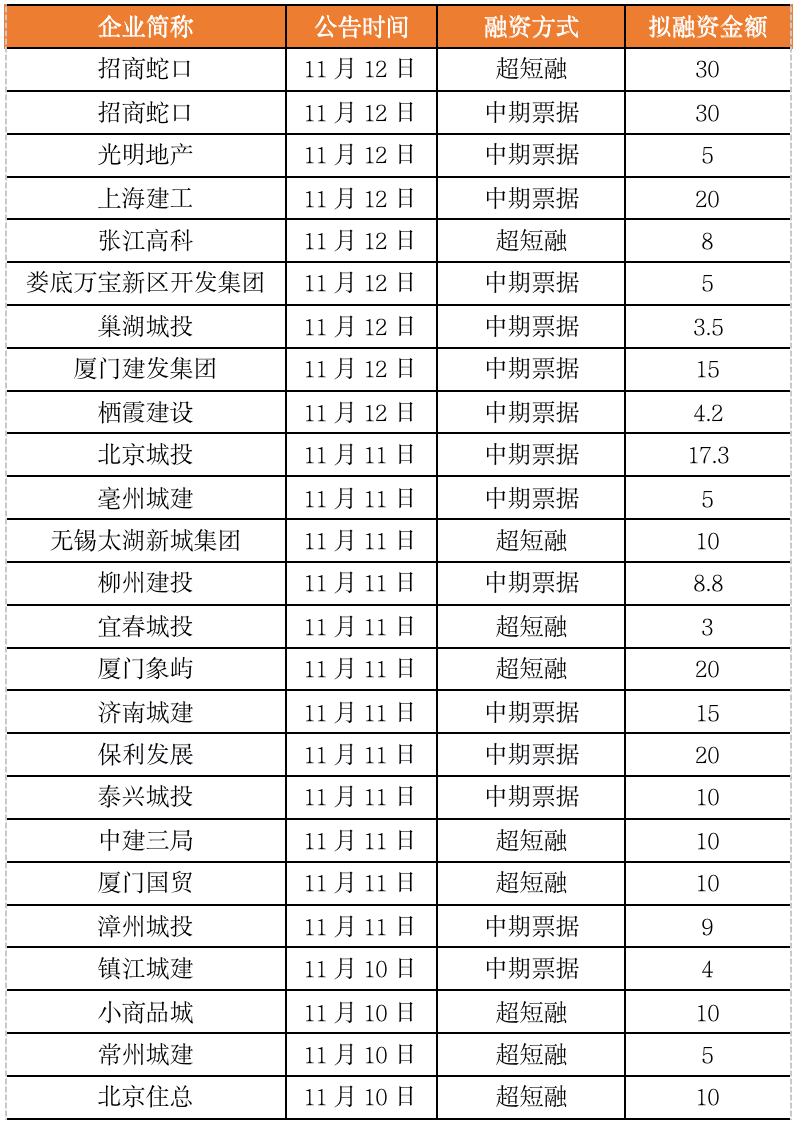 值得注意的是,11月11日,保利發展擬發行20億元中期票據,將銀行間債券市場的融資主體從城投擴展到主流房企,隨后,光明地產和招商蛇口等紛紛公告擬發行中期票據和超短融,企業融資“冰凍”狀態有所緩解。