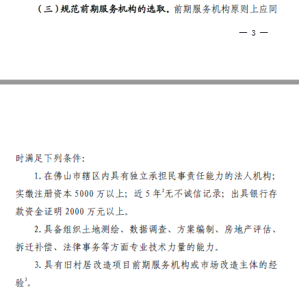 1、新政對前期服務機構相關準入條件作了嚴格規定,為滿足公司對佛山區域舊村居改造項目改造推進節奏、力度,法務中心建議:提前布局、設立相關符合新政前期服務公司、市場改造主體要求的各類企業。