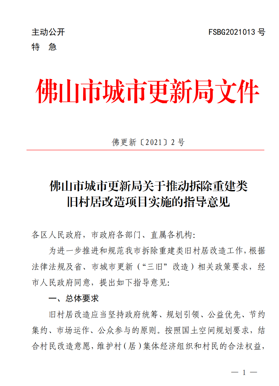 2021年3月2日,佛山市城市更新局主動公開并發布了《佛山市城市更新局關于推動拆除重建類舊村居改造項目實施的指導意見》(佛更新【2021】2號文),從新政發布文號(2號文)以及加急程度(特急)來看,無不體現了佛山市城市更新局對于2021年佛山市舊村居改造的重視程度。