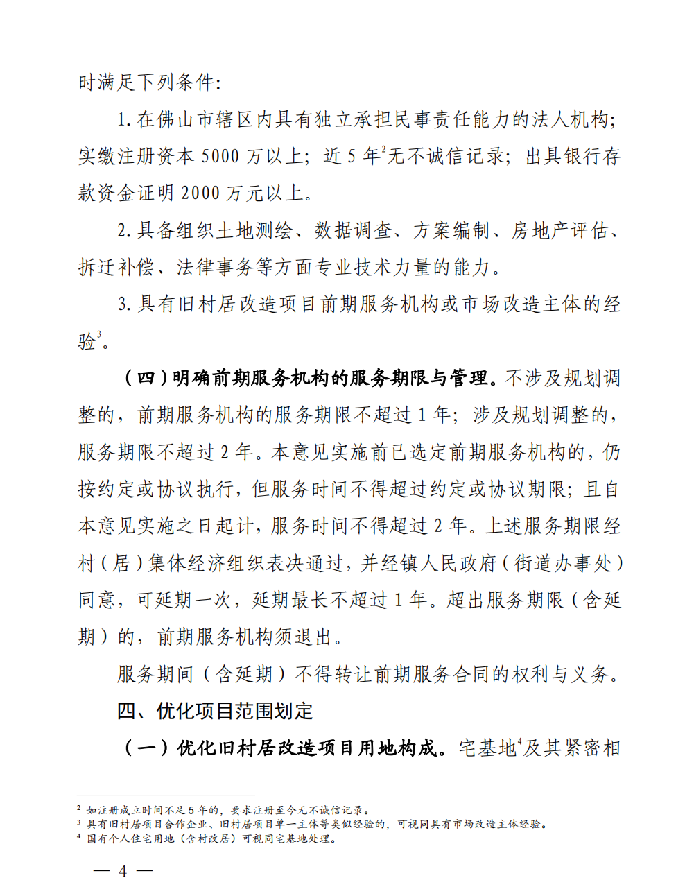 注意事項:本部分主要內容明確了前期工作內容及選取方式等,其中尤為需要注意的是,本次新政對前期服務機構設置了一定的硬性條件,如要求實繳注冊資本金5000萬以上,出具銀行存款資金證明2000萬以上,需要具有舊村居改造項目前期服務機構或市場改造主體的經驗。