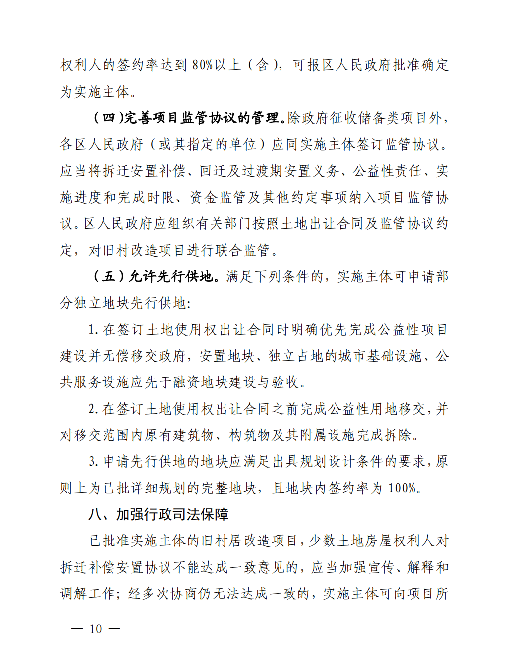 注意事項:本部分內容對實施方案的表決與報批程序做了較為細致的的規定,明確了轉為實施主體的具體要求和監管協議的管理方法,但新政顯著區別于其他城市舊改政策的兩個亮點是:1、明確市場改造主體在與土地房屋權屬人簽訂補償安置協議后,可按協議約定向不動產登記機構申請辦理被拆遷房屋的相關預告登記,但該預告登記程序對應的法律后果是什么,目前尚未可知;2、明確在一定條件下,實施主體可申請部分獨立地塊的先行供地,區別于其他城市一般要求完成復建或復建地塊工程進度需優先于融資地塊,方可進行供地的政策,佛山該先行供地的政策是本次新政的一大亮點。