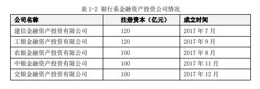 2016年10月國務院《關于市場化銀行債權轉股權的指導意見》,明確了銀行通過向實施機構轉讓債權、由實施機構將債權轉為對象企業股權的方式實現市場化債轉股。2017年7月20日銀監會批準建信金融資產投資有限公司開業,隨后農銀、工銀、中銀、交銀相繼獲批開業,五大行的AIC成立(見表1-2),主業為市場化債轉股。