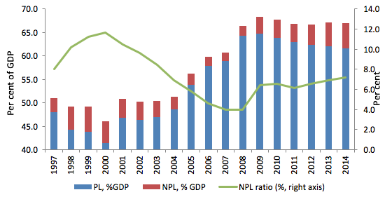 令人擔憂的是,持續(xù)走高的不良貸款鎖定了復蘇緩慢的本質。對于借款人來說,債務償還的延遲使得難以獲得更多的信貸,這往往導致第二輪債務違約和公司破產。貸款機構也受到了影響。被大量不良貸款困擾的銀行可能會專注于內部整合和提高資產質量,而不是提供新的信貸(里昂Leon 和 特蕾西Tracey 2011)。高不良貸款率需要更多的貸款撥備,這會減少可供貸款的資本資源,并降低銀行的盈利能力。有證據表明,不良貸款率高是銀行破產的重要預測因素,并扭曲了銀行的成本結構和效率(Lu and Whidbee 2013, Maggi and Guida 2009, Cucinelli 2015)。這種扭曲的一個例子是日本銀行“僵尸貸款”(zombie lending)的案例,其目的是拯救受到壞賬困擾的企業(yè),這導致了上世紀90年代初資本配置不當和經濟增長放緩( 卡巴列羅Caballero 等人2008)。