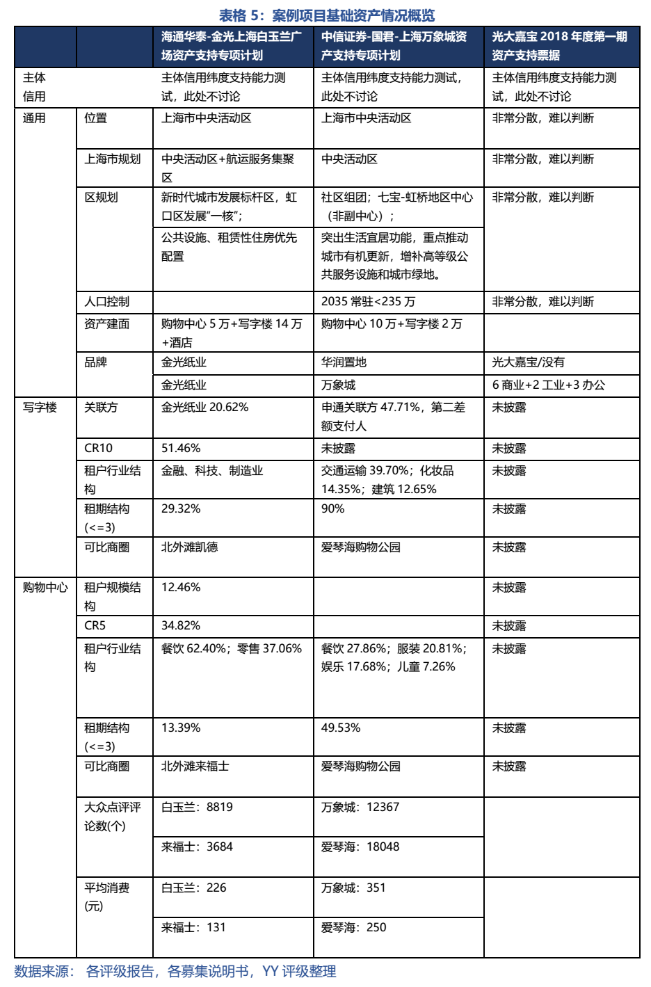 除光大嘉寶外,華潤萬象城、金光白云蘭均為中央活動區(外環內)單一地點的辦公、零售混合類物業,而光大嘉寶的資產池包含了6個零售物業、3個辦公物業和2個工業物業,且位置分散,基本都處于外環外。