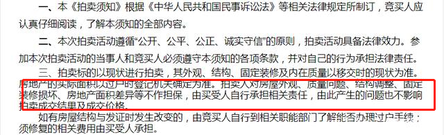 上圖是法院公告競買須知的前幾條,我們詳細看其中的第三條,公告明確表示了以移交時的現狀為準,拍賣人對房屋外觀、質量問題等不做擔保。