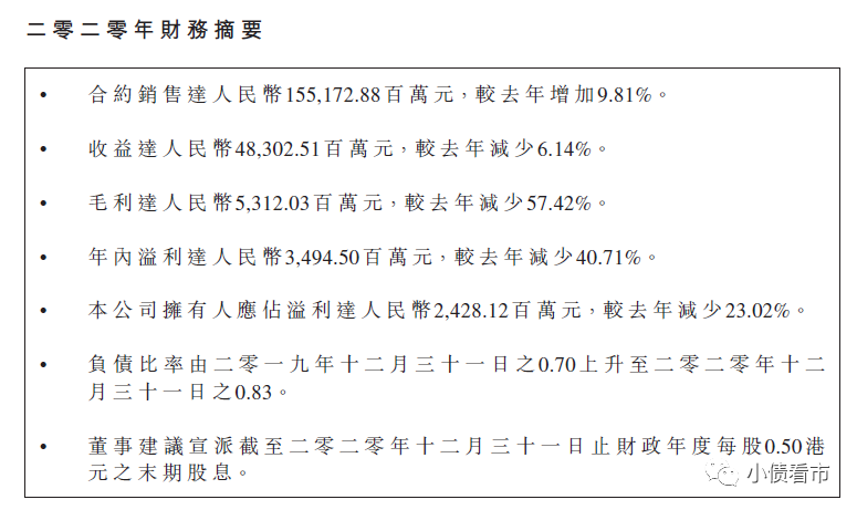 2020年,融信中國實現營業收入483.03億元,同比下滑6.14%;實現歸母凈利潤24.28億元,同比下滑23.02%;負債比率由2019年末的70%上升至83%。