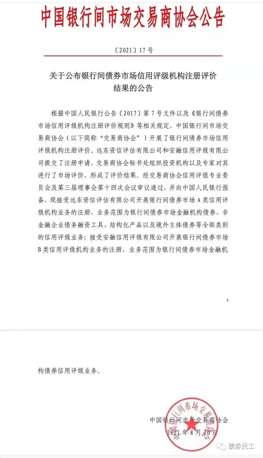 根據銀行間市場交易商協會2021年8月20日披露的《關于公布銀行間債券市場信用評級機構注冊評價結果的公告》,遠東資信評估有限公司被評定為A類信用評級機構,可以從事金融債券、非金融企業債務融資工具、結構化產品和境外主體債券的評級;安融信用評級有限公司被評定為B類信用評級機構,可以從事金融債券的評級。