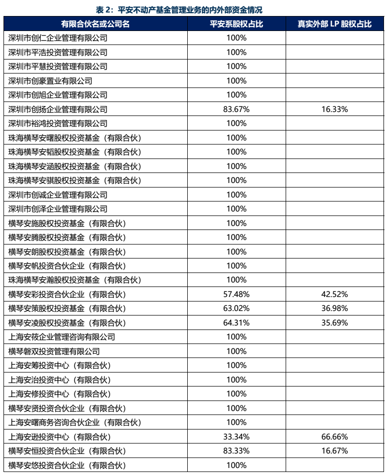 GP+LP模式的層層嵌套下,大多數(shù)LP為平安系公司或其關(guān)聯(lián)公司(包括深圳市陸虹投資管理有限公司)。在打造市場化資產(chǎn)管理公司的口號(hào)聲下,此舉形同粉絲打榜買熱搜。不過,由于LP資金多為自家人注資,從另一角度亦可視作杠桿度較低,風(fēng)險(xiǎn)較低。
