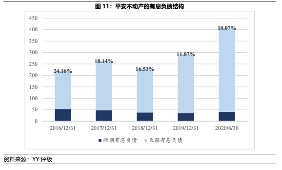 由于平安不動(dòng)產(chǎn)的管理規(guī)模擴(kuò)增是基于平安集團(tuán)的LP資金(體現(xiàn)于長期股權(quán)投資方面的表外)注入,而表內(nèi)的結(jié)構(gòu)穩(wěn)定則是基于主動(dòng)投資收益尚能覆蓋財(cái)務(wù)費(fèi)用,疊加被動(dòng)收入和股東背景支持。因此圖11可見,隨著有息負(fù)債杠桿的增加,平安不動(dòng)產(chǎn)仍能維持相當(dāng)?shù)捅壤亩唐谟邢鶆?wù)。