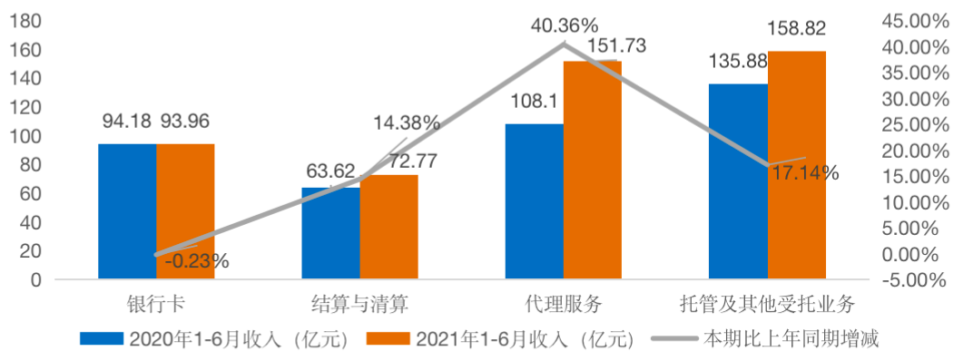 2021年上半年,招商銀行實(shí)現(xiàn)非利息凈收入694.08億元,同比增長20.75%,主要得益于托管及其他受托業(yè)務(wù)傭金收入、代理服務(wù)手續(xù)費(fèi)的快速增長,即大財(cái)富管理業(yè)務(wù)的貢獻(xiàn)。其中,代理服務(wù)收入費(fèi)由108.1億元增至151.73億元,增幅達(dá)40.36%;托管及其他受托業(yè)務(wù)傭金由135.88億元增至158.82億元,增幅達(dá)17.14%。