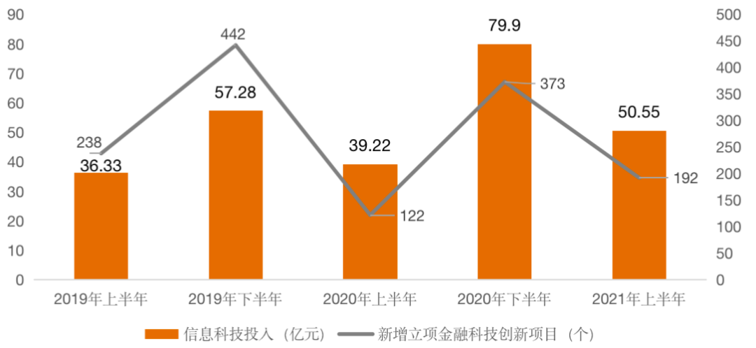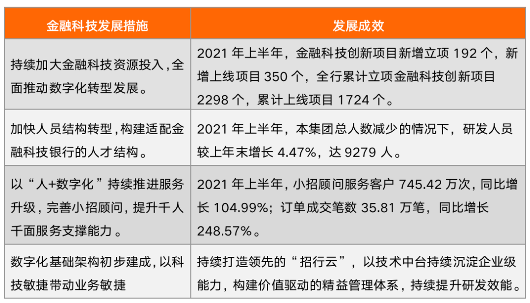 招商銀行在資源投入、人才結(jié)構(gòu)、服務(wù)能力和科技水平等四個方面,推動金融科技發(fā)展,取得了顯著成效。2021年上半年,招行信息科技投入50.55億元,與上兩年同期相比有所增加,同期該行金融科技創(chuàng)新項(xiàng)目新增立項(xiàng)192個,新增上線項(xiàng)目350個,研發(fā)人員較上年末增長4.47%,達(dá)9279人。