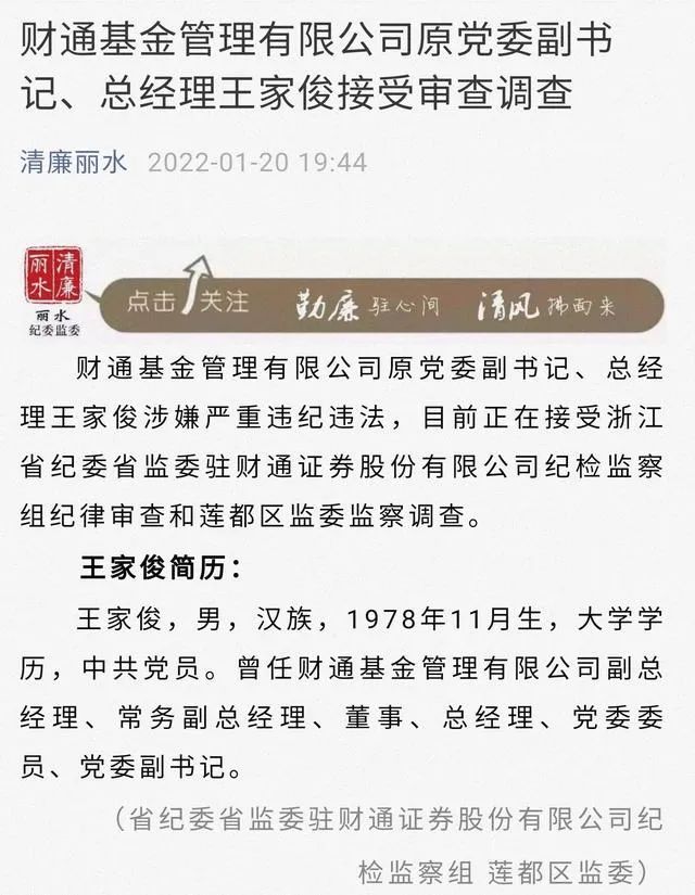 1月20日,財通基金原黨委副書記、總經(jīng)理王家俊涉嫌嚴(yán)重違紀(jì)違法,目前正在接受紀(jì)律審查和監(jiān)察調(diào)查