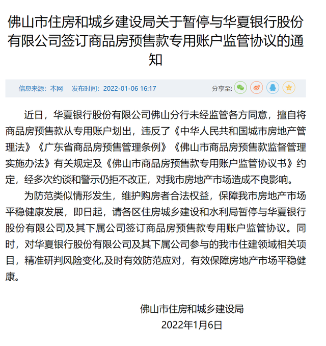 1月6日,華夏銀行佛山分行被佛山市住建局通報,起因是其未經(jīng)監(jiān)管各方同意,擅自將佳兆業(yè)悅峰項目的商品房預(yù)售款從專用賬戶劃出,違反規(guī)定且拒不改正。