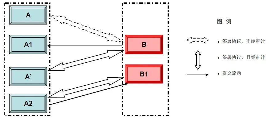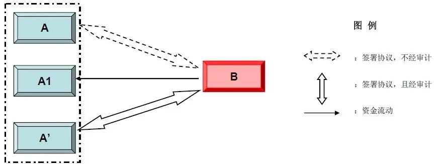 其中B為收購方,A為轉讓方,A1受A的實際控制但沒有直接的股權關系,A’為A的合作伙伴