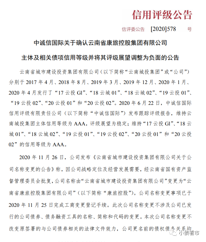 由于盈利能力弱,債務償付壓力大等原因,“云南省級城投”康旅控股評級展望被下調,不久前受永煤違約影響,其離岸美元債暴跌。