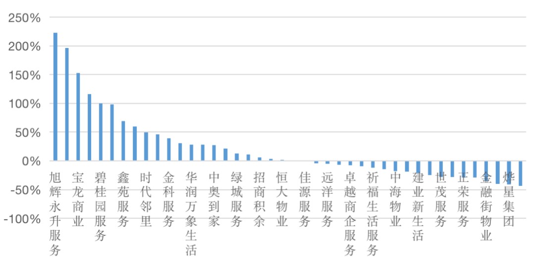 經(jīng)歷了2020年的上市潮,物管行業(yè)在資本市場的整體表現(xiàn)正在趨于理性。2019年24家上市物企全年股價漲幅均值為58.02%,到了2020年,上市物企數(shù)量達到42家,整體股價漲幅均值卻降為21.55%,其中僅有15家股價漲幅超過均值,超6成物業(yè)股股價漲幅低于板塊均值。