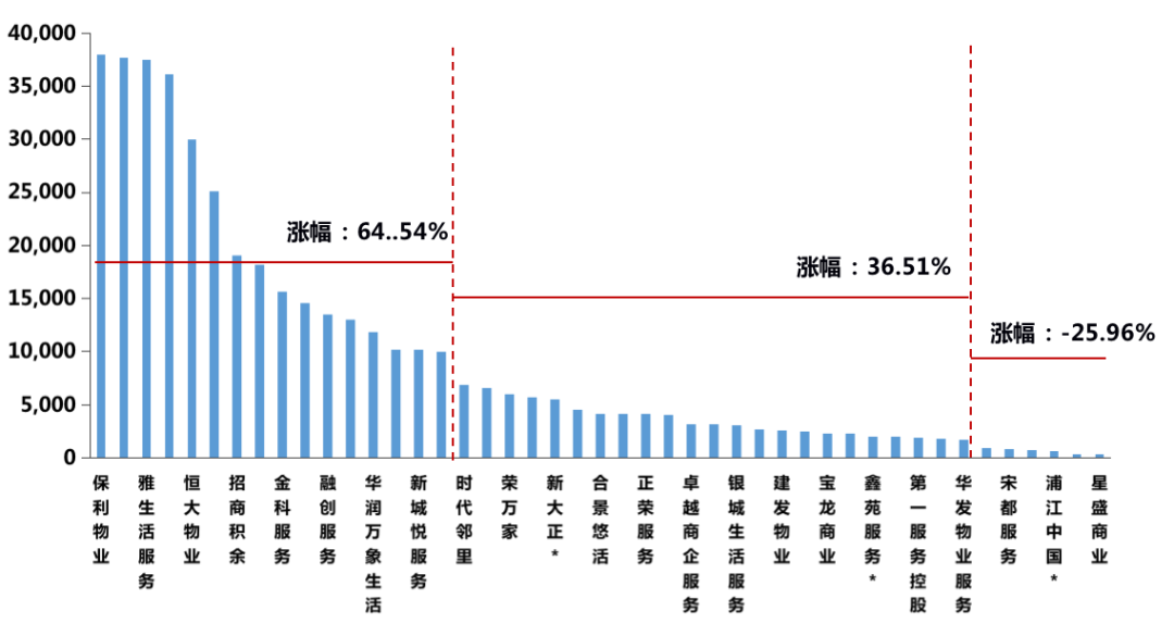 圖:2020年物企在管規(guī)模及各梯隊股價平均漲幅