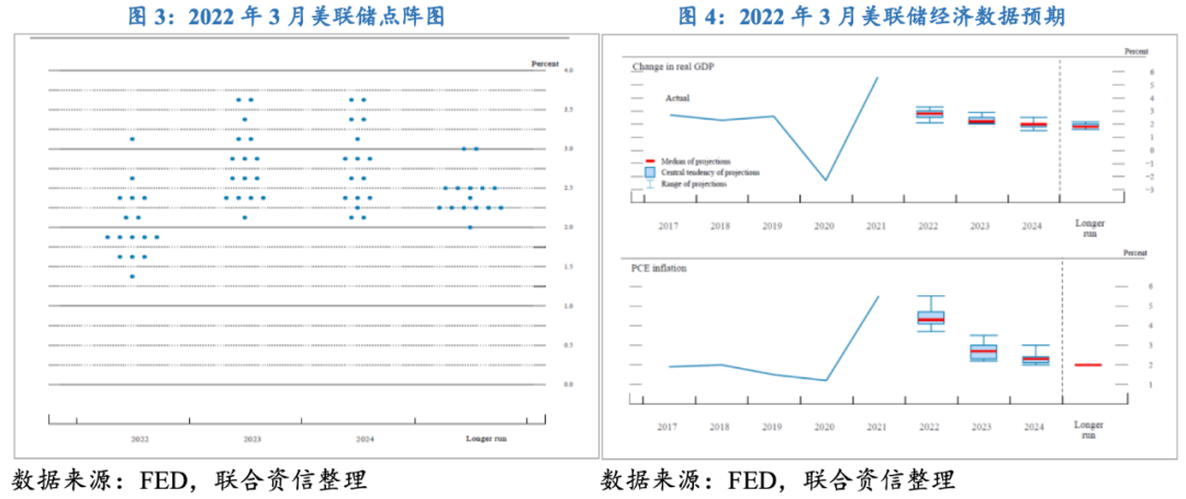 從美聯儲經濟預測數據看,美聯儲希望通過本輪貨幣政策收緊來逐步緩和通脹壓力,預計PCE通脹中樞將在2022年回落至4%左右,較2021年回落1個百分點;2023年PCE通脹中樞可回落至3%,2024年PCE通脹極大值則有望回落至2%,2025年后PCE通脹中樞便可回落至2%的通脹目標。與此同時,美聯儲預期本輪貨幣政策收緊對經濟增長以及就業帶來的影響較小,預計2022年美國經濟增速中樞將達到3%,2023年以后美國經濟恢復每年2%左右的勻速增長;2022年失業率中樞約為3%,未來幾年小幅走高,預計到2025年上漲至4%左右。整體看,美聯儲預期(在無較大黑天鵝事件的影響下)本輪貨幣政策緊縮周期或為2022-2024年,第一年大概率共計加息7次,第二年或加息3次,第三年逐步退出加息。而本次貨幣政策收緊需要以保障經濟平穩增長以及失業率小幅走高為前提,預計會采取相對溫和的方式,比如單次加息25個BP、非主動拋售債券縮表等方式。