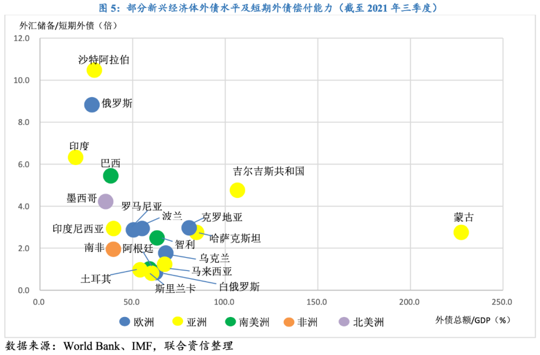 雖然美聯儲本輪加息預計較沃爾克時代更為溫和,但在后疫情時代疊加俄烏戰爭爆發的背景下,部分新興經濟體的經濟、金融結構缺陷將愈加明顯,導致其抵御外部風險沖擊的能力較差,因此本輪美聯儲加息或放大新興經濟體的脆弱性。一方面,疫情后新興經濟體的外債壓力不斷走高,尤其是以蒙古、吉爾吉斯斯坦、哈薩克斯坦等為代表的“高負債窮國”,由于本國融資能力有限以及外匯儲備嚴重匱乏,轉而通過舉借外債的方式補充資金,導致疫情后外債壓力大幅走高,三國外債水平均超過80%。本輪美聯儲或在2022年-2024年間累計加息10次,上調超過200個BP,直接加重這些“高負債窮國”的外債再融資壓力。從外匯儲備對短期外債的保障程度來看,截至2021年三季度,斯里蘭卡和白俄羅斯的外匯儲備對短期外債的保障程度僅約80%,土耳其和阿根廷的外匯儲備僅足夠支付其短期外債,未來外債償付面臨較大的不確定性。另一方面,美聯儲加息后帶動國際資本回流美國,在推高美元幣值的同時加劇新興經濟體的匯率風險,尤其是本幣較為脆弱的土耳其以及處于歐美制裁中的白俄羅斯,這兩國本幣兌美元匯率分別較年初下跌10.1%和9.8%,進一步加大了新興經濟體的外部風險敞口。