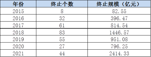 根據上交所公司債券信息平臺數據顯示,2015年10月20日至2021年5月26日,“終止”ABS項目單數為308單,對應規模為6901.79億元。其中2015年終止8單,82.55億元;2016年終止32單,396.47億元;2017年終止61單,814.54億元;2018年終止83單,1446.57億元;2019年終止55單,951.08億元;2020年疫情期間終止27單,796.25億元;2021年終止44單,2414.33億元。具體情況如下圖表所示:
