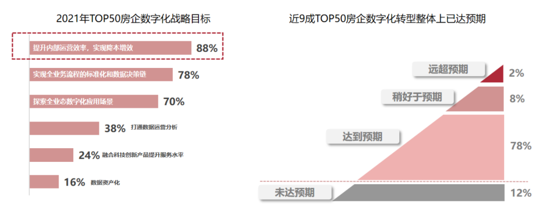 在對 TOP50 房企的調研中我們發現,有近九成頭部房企將“提升運營效率,實現降本增效”作為2021年的首要數字化戰略目標。從這個壓倒性的比例當中,我們可以看到頭部房企務實的發展態度,但同時也體現出頭部房企目前整體的數字化水平處于初級階段,以期數字化轉型能夠在運營的維度對企業有所助益,對于數據資產化與科技融合提升等訴求尚未成為主流。