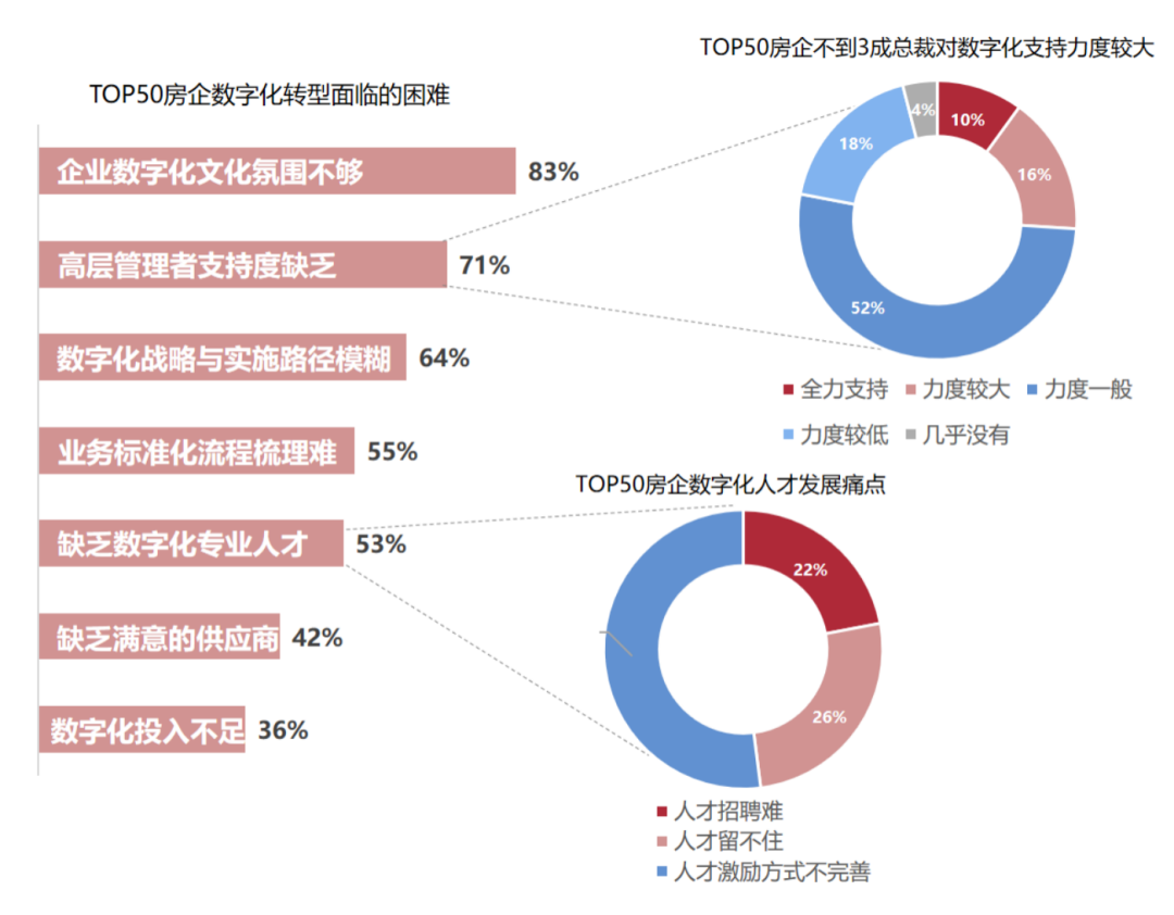 “企業數字化文化氛圍不夠”、“高層管理者支持度缺乏”是TOP50房企數字化轉型目前面臨的首要難題。
