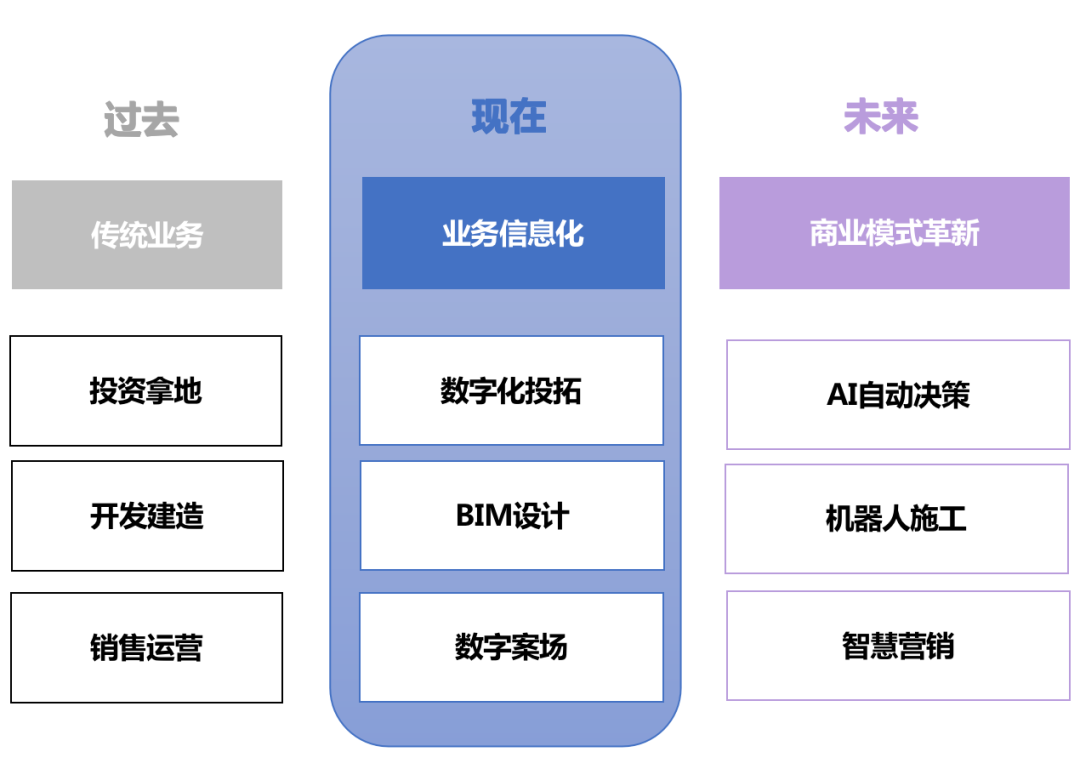 當前頭部房企數字化轉型剛邁過信息化建設階段,正處在數字化轉型的初期。過往頭部房企的管理與運營資源大多聚焦于傳統業務的拓展方面,現階段房企發展的著力點將是通過數字化轉型賦能,實現傳統業務的提質增效與新業務機會的拓展與深化。