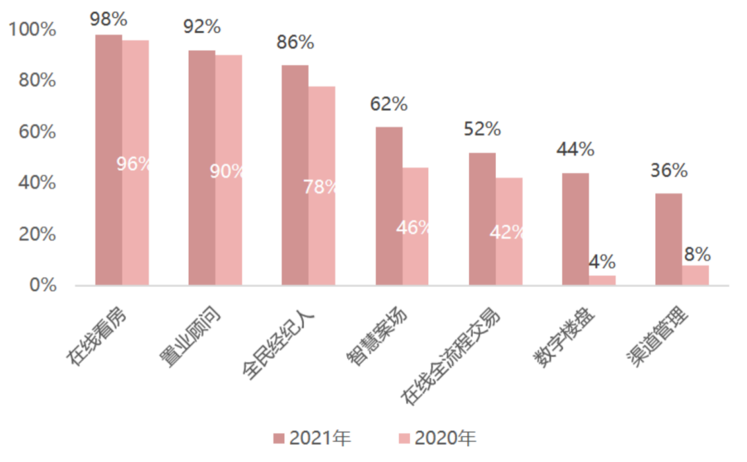 目前在線看房平臺、置業顧問工具、全民經紀人系統、智慧案場等應用在頭部房企的普及度較高,相較2020年,場景建設比率均有所提升,在線看房平臺與置業顧問工具的應用保持穩定增長且覆蓋率在90%以上。
