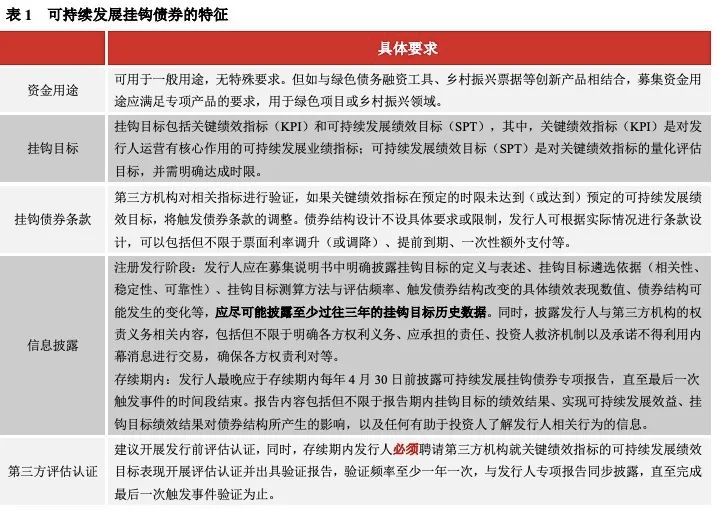 可持續(xù)發(fā)展掛鉤債券(Sustainability-Linked Bond,簡稱SLB)是指將債券條款與發(fā)行人可持續(xù)發(fā)展目標相掛鉤的債務融資工具。國際上,可持續(xù)發(fā)展掛鉤債券最早出現于2019年的歐洲,國際資本市場協(xié)會(ICMA)2020年6月推出指導性文件《可持續(xù)發(fā)展掛鉤債券原則》。交易商協(xié)會在借鑒國際經驗的基礎上,創(chuàng)新推出可持續(xù)發(fā)展掛鉤債券,根據《可持續(xù)發(fā)展掛鉤債券(SLB)十問十答》,可持續(xù)發(fā)展掛鉤債券有如下特征。