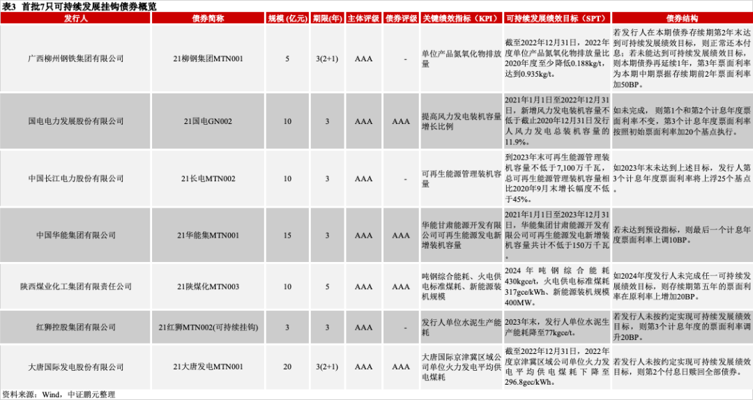 銀行間債券市場首批有7家企業(yè)發(fā)行了可持續(xù)發(fā)展掛鉤債券,募集資金規(guī)模73億元,具體情況見表3。從發(fā)行人來看,有電力、鋼鐵、煤化工、水泥生產企業(yè);發(fā)行人主體信用級別均為AAA級;可持續(xù)發(fā)展掛鉤債券的發(fā)行期限以3年為主;掛鉤的關鍵績效指標有新能源發(fā)電裝機容量、單位產品能耗和污染物排放量,掛鉤的債券結構設計有續(xù)期、利率調升、贖回。