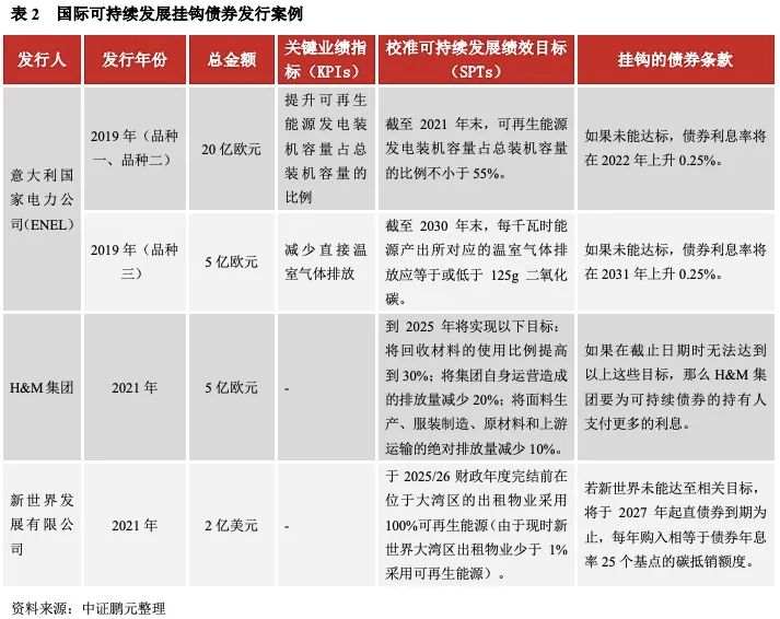 根據《可持續(xù)發(fā)展掛鉤債券(SLB)十問十答》,可持續(xù)發(fā)展掛鉤債券已累計發(fā)行總額約180億美元,發(fā)行人涉及電力、鋼鐵、水泥、建筑等多個行業(yè)。我們根據公開信息搜集到幾個發(fā)行案例,發(fā)行人所屬行業(yè)有電力、服裝、建筑,如表2所示,國際發(fā)行的可持續(xù)發(fā)展掛鉤債券掛鉤的債券條款有利率調升、購入碳抵銷額度等。