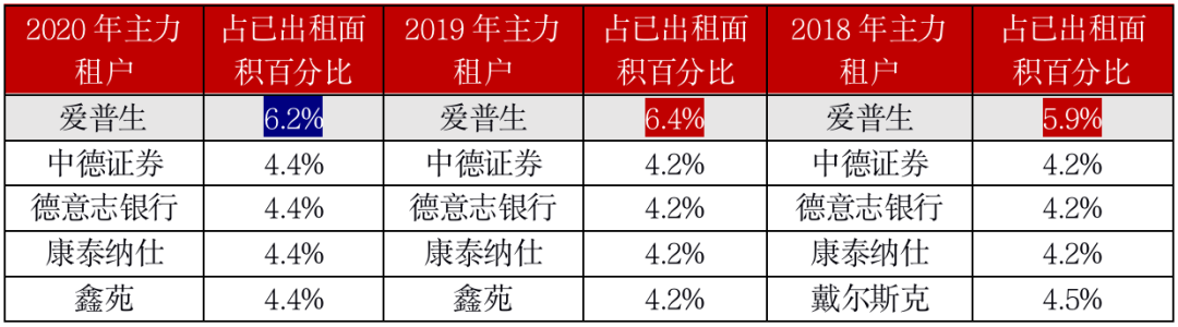黑天鵝事件下,外加中美貿(mào)易戰(zhàn)影響,大量企業(yè)通過減少租賃面積、逃離核心商圈,最大程度減少辦公成本。據(jù)春泉REITs披露的華貿(mào)中心租戶結(jié)構(gòu),以金融、保險及投資租戶為主,占總租賃面積的38%,與2019年基本一致;其次為專業(yè)及商業(yè)服務(wù)業(yè),占總租賃面積的19%,較2019年微漲1%。主力租戶的穩(wěn)定支撐了春泉2020年的業(yè)績表現(xiàn)。