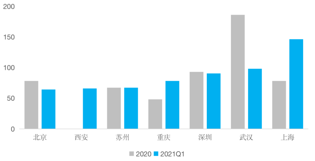各城市存量資產(chǎn)ABS產(chǎn)品發(fā)行周期變化2020VS2021Q1