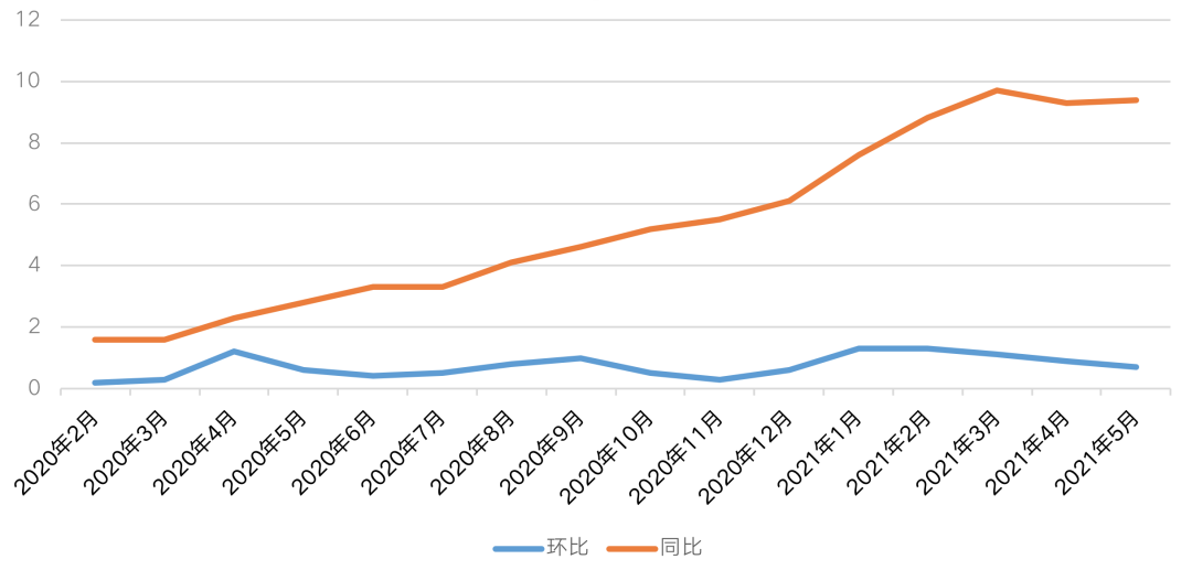 從房價的角度而言,國家統(tǒng)計局數(shù)據(jù)顯示,自2020年以來上海二手房價格指數(shù)持續(xù)走高,其中同比上漲幅度增加較為明顯,5月二手住宅房價同比上漲9.5%。