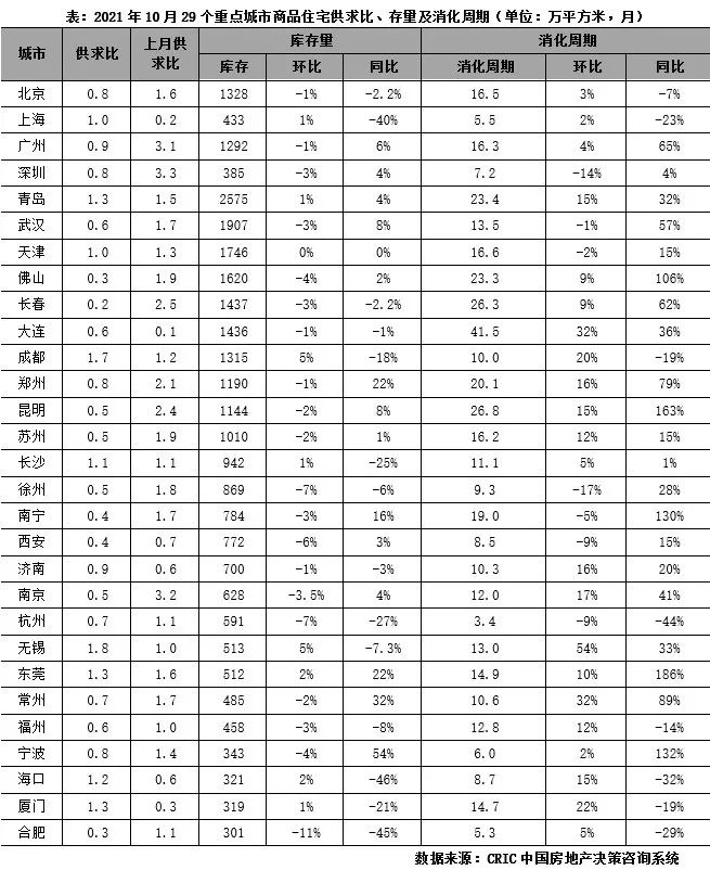 “金九”銷售節點過后,三四線城市新盤推貨量下滑下,10月熱點城市供應環比下滑較成交更為顯著,故短期呈現供不應求。29個重點城市整體供求比略低于0.8。