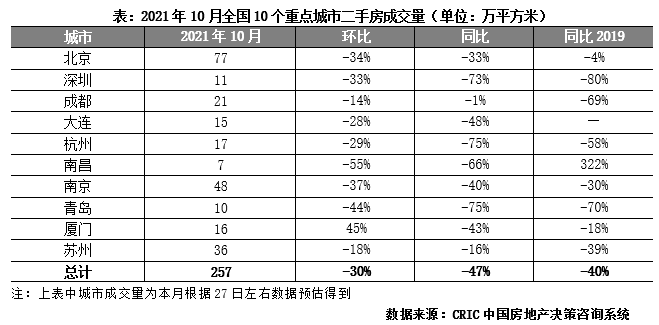 2021年10月,二手房市場整體延續下行走勢,規模上環比再降30%,10個重點城市共計成交257萬平方米。較去年同期相比規模收窄48%,同比2019年跌幅也高達40%,受困于全國樓市政策“嚴苛”,熱點城市調控力度有增無減,整體市場熱度降溫顯著。