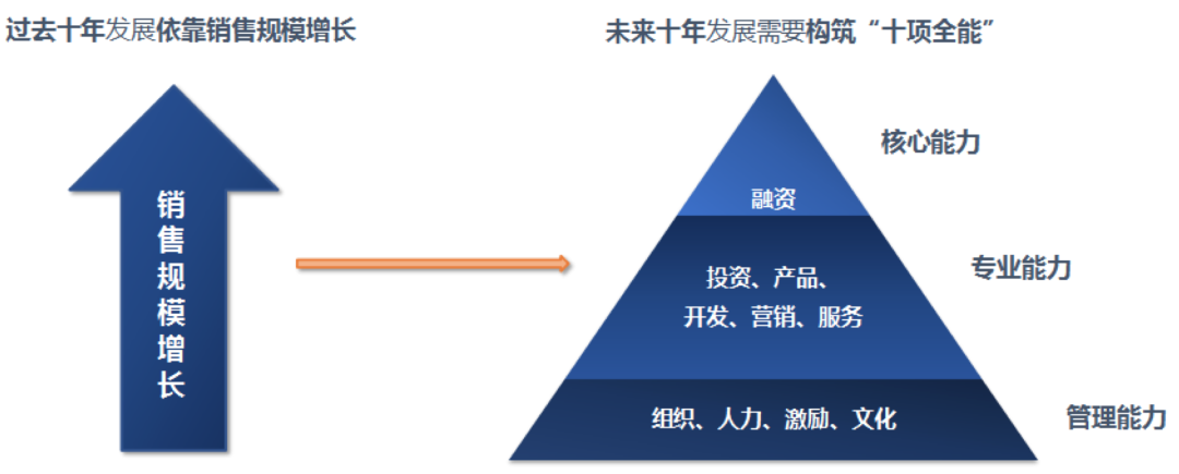 第二,企業(yè)經(jīng)營戰(zhàn)略、經(jīng)營理念、經(jīng)營模式隨行業(yè)發(fā)展而轉(zhuǎn)變是績效管理調(diào)整的直接原因。房地產(chǎn)行業(yè)新的時代背景下,房企也從過去銷售“一枝獨秀”逐漸過渡到需要構(gòu)建“十項全能”的能力。