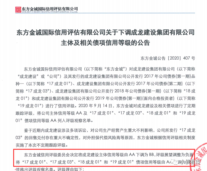 近日,東方金誠公告稱,將成龍建設(shè)集團(tuán)有限公司(以下簡稱“成龍集團(tuán)”)主體信用等級由AA下調(diào)為BB,評級展望調(diào)整為負(fù)面;將“17成龍01”、“17成龍03”、“18成龍01”和“19成龍01”債項(xiàng)信用等級由AA下調(diào)為BB并移出評級觀察名單。