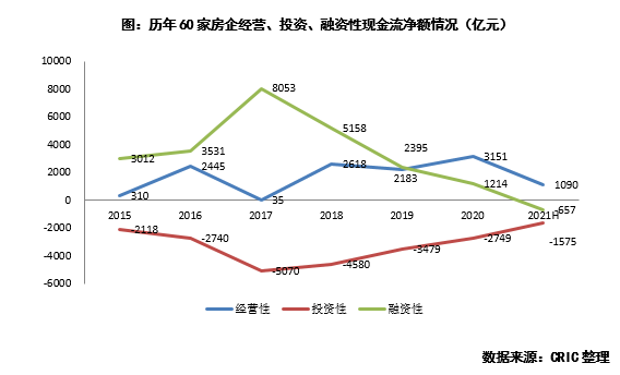 在此背景下,越來越多的房企開始重視回款、控制投資。2020年經營性現金流凈額為凈流入3151億元,為歷年最高,首次超過了融資性現金流凈額;2021年上半年,經營性現金流凈額為凈流入1090億元,而上年同期為凈流出503億元,預計全年經營性現金流或將進一步增加。