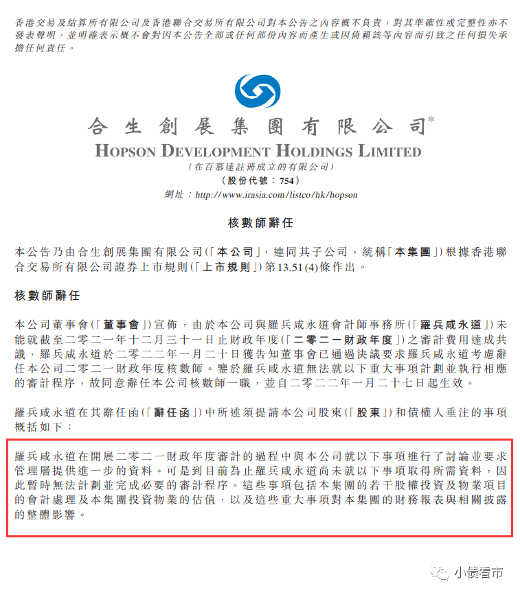 值得注意的是,除了提到與會計師事務(wù)所在費用上存在分歧之外,合生創(chuàng)展還稱未按照前任審計師要求提供信息。