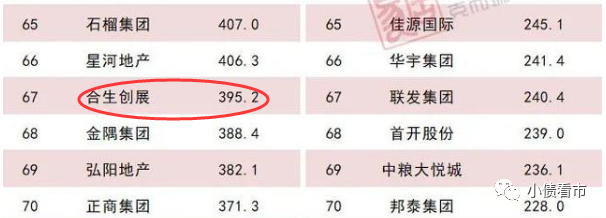 據(jù)克而瑞數(shù)據(jù),合生創(chuàng)展以395.2億操盤金額位居房企第67位,體量上看屬于中小型房企。