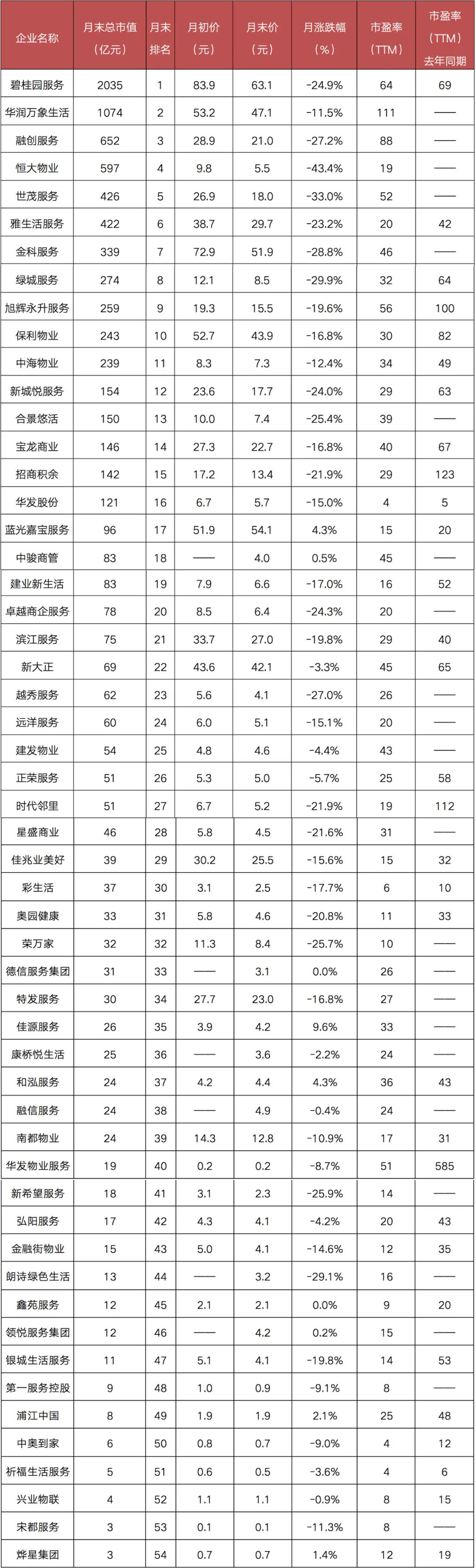 從與月初價的對比來看,7月跌幅前三分別為恒大物業、世茂服務、綠城服務,跌幅分別為43.4%、33.0%、29.9%。在7家微漲的企業中,漲幅最高的為佳源服務,達9.6%,藍光嘉寶服務與和泓服務以4.3%的漲幅位列二、三。