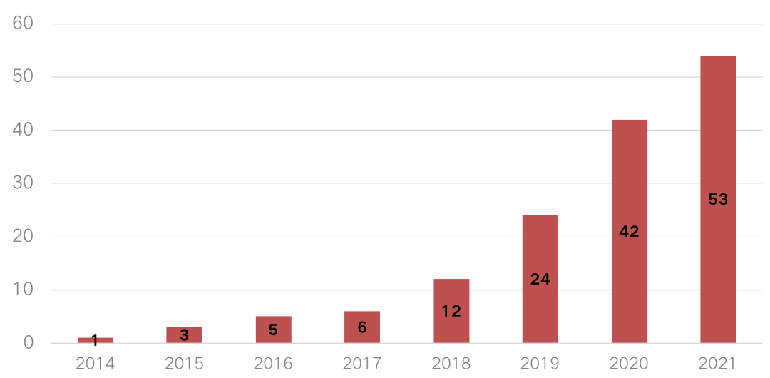 圖:2014年-2021年上市物企數量分布(個)