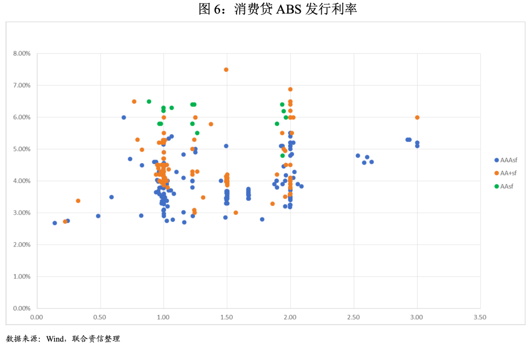 2021年,消費貸ABS債項主要集中在AAAsf、AA+sf和AAsf,不同信用等級的債項呈現出明顯的信用利差,AAAsf級債項的平均發行利率為3.9%,AA+sf級債項的平均發行利率為4.5%,AAsf級債項的平均發行利率為6.0%。