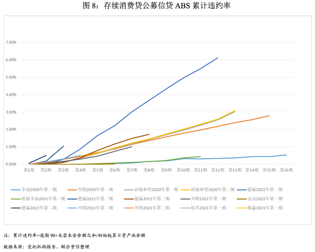 由于數據可獲得性,本文對消費貸ABS存續期表現觀測,主要基于截至2021年底存續且已披露受托機構報告的公募信貸ABS產品。