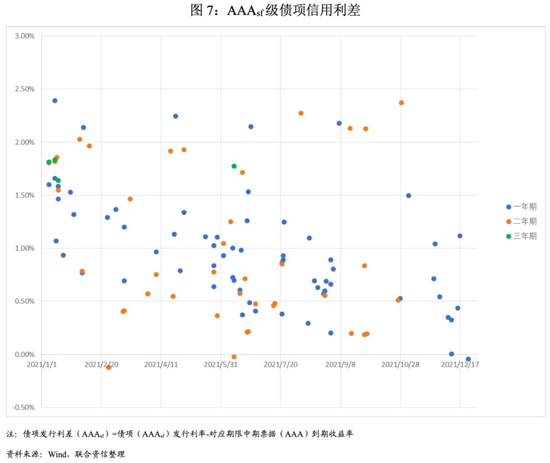 2021年,消費貸ABS債項普遍高于對應期限中期票據債項利率,AAAsf級別下,1年期債項利差均值為98bp,2年期債項利差均值為99bp,3年期利差均值為177bp。