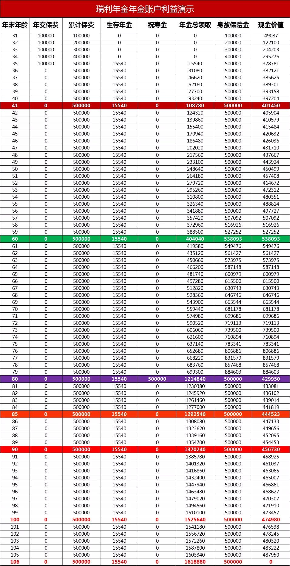 這點(diǎn)不用擔(dān)心,死亡有身故保障金,什么時(shí)候掛都不會(huì)虧本。換句話說,如果80歲前身故,可以每年領(lǐng)錢,身故時(shí)還有身故保障金。