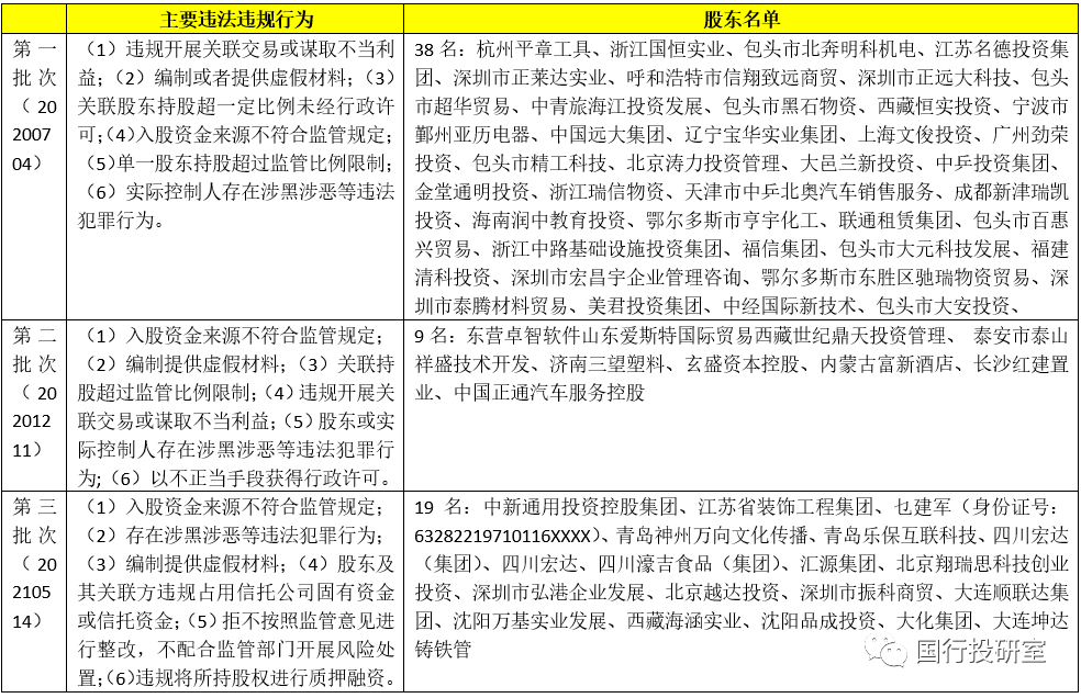 (2)2020年銀保監(jiān)會開展專項整治“回頭看”,覆蓋4600余家銀行保險機(jī)構(gòu),不僅首次開展了覆蓋全部商業(yè)銀行和保險公司的公司治理監(jiān)管評估以及銀行保險機(jī)構(gòu)股權(quán)和關(guān)聯(lián)交易專項整治工作,還先后分三批次向社會公開了銀行保險機(jī)構(gòu)重大違法違規(guī)股東(合計66家)。